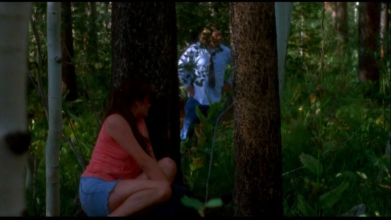 She hears something and wanders around a bit. Just as you think she's about to be the next victim of the unseen thing in the woods, Matt spooks her.