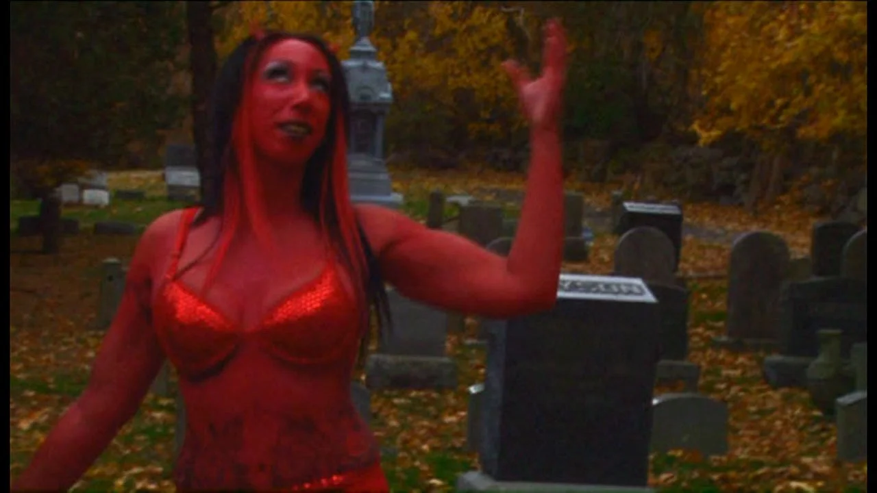 We then cut to a graveyard, where the cult leader, now possessed by Satan and turned red, dances around a graveyard for more time than is entirely necessary.