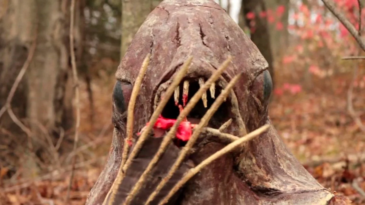 The newly married couple are driving off to their honeymoon, when Phillipe needs his wife to pull over, so he can use the woods. He heads deep deep DEEEP into the woods, so he doesn't get caught for indecent exposure. Unfortunately, the Riverbeast puts on the red lights to tell you what's coming/