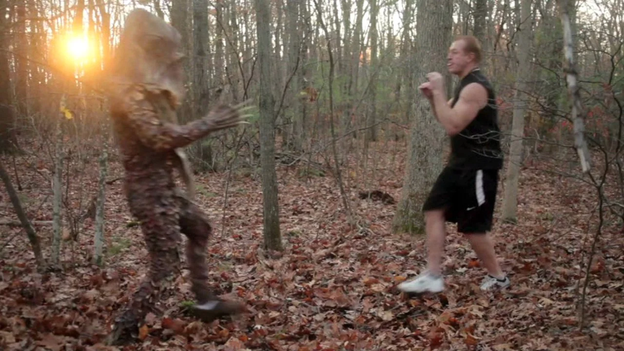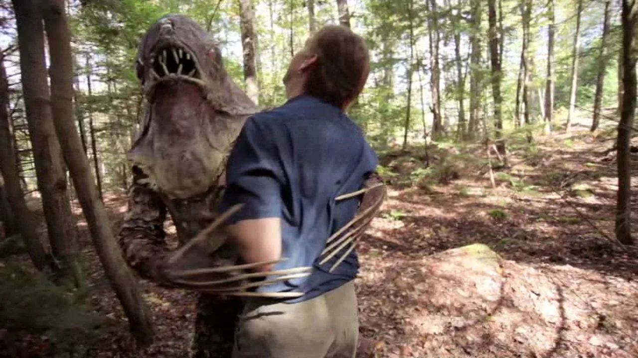 The screen flashes, and the Riverbeast arrives, slap fighting with Neil. Allie shows up, and Neil directs her out of the woods, and sends her to get her dad. The other guys pile on the Riverbeast to help Neil while they wait for backup.