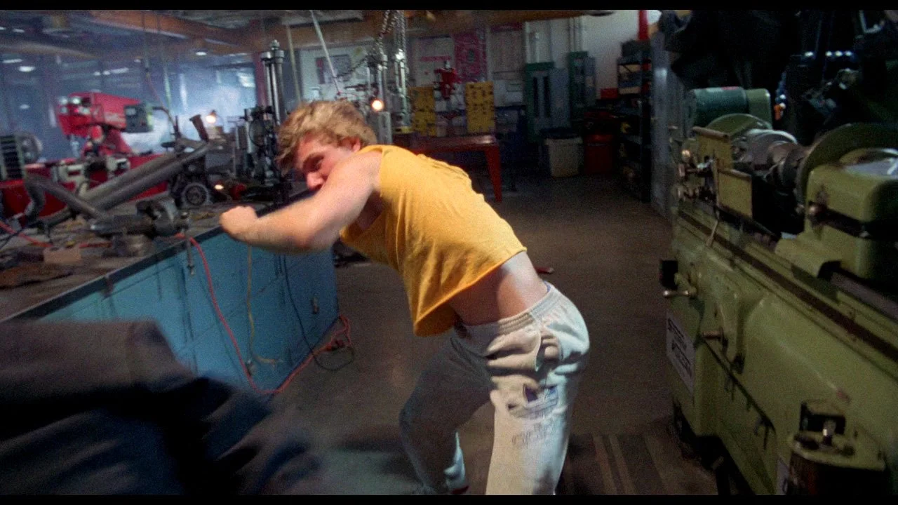 So, the chase continues, into the shop classroom, where I am sure there will be no danger as they fight around industrial equipment