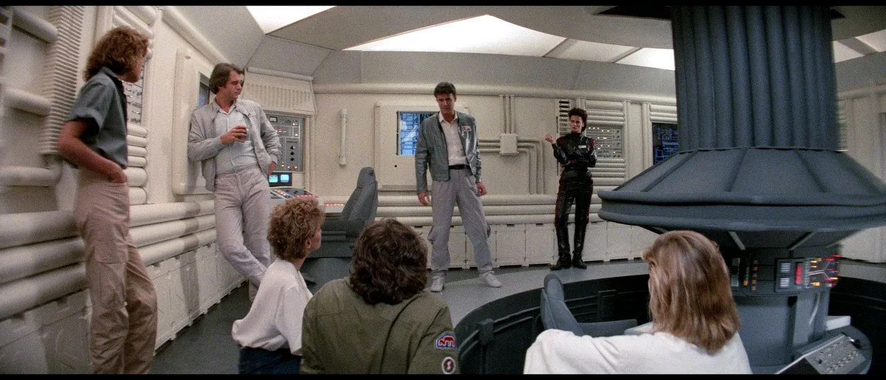 Our three survivors head to the bridge to catch their breath, regroup, and figure out what to do next. Sladen suggests electrocuting the creature like in the old Earth film, the Thing from Another Planet.