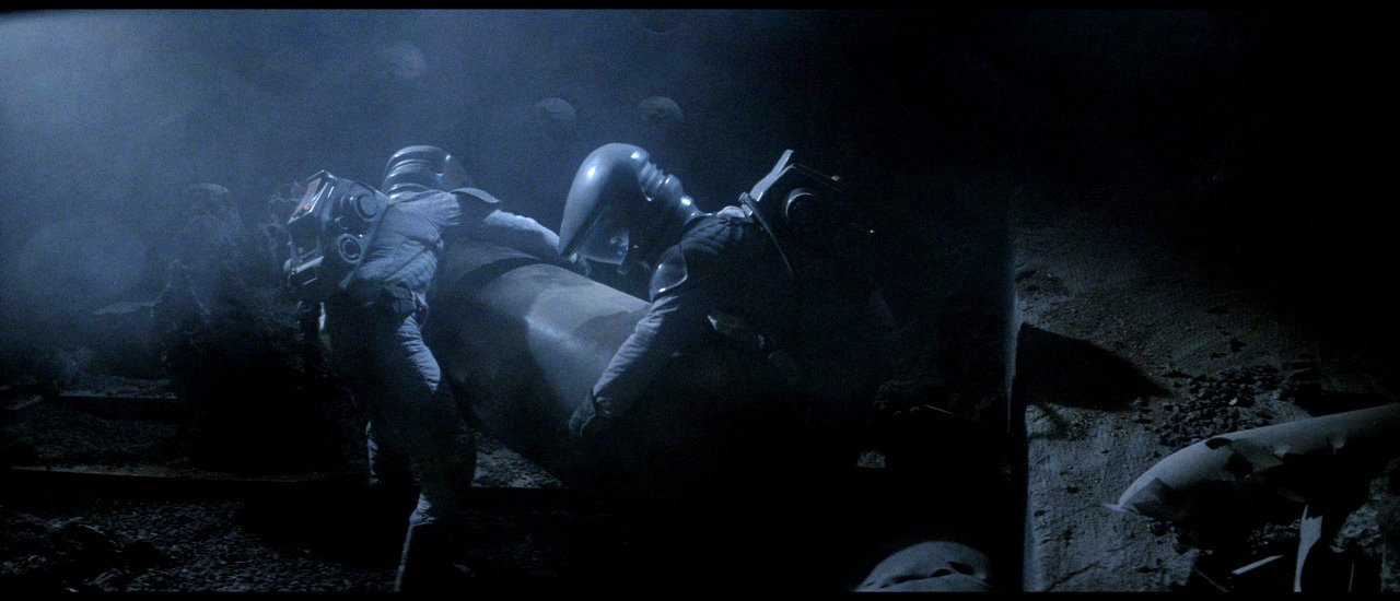 Bryce grabs Davison and hurries him back to the ship before he dies from lack of oxygen. If anyone is wondering, they DO establish the moon has a small, but very thin, atmosphere, so this isn't as impossible as it looks from my summation.