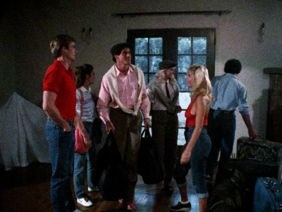 As the girls arrive, the boys are milling about, and we establish Barney as a chronic worrier, who thinks everything is a horror movie. To the point where he even namechecks hoping some guy named Jason in a hockey mask doesn't show up.