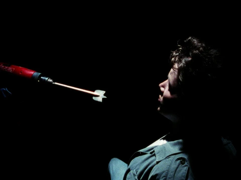 There's a few other cars making their way to the house, but while everyone converges, the delivery boy is tied to a chair, and is about to get an up close and personal demonstration on trepanning from our killer.