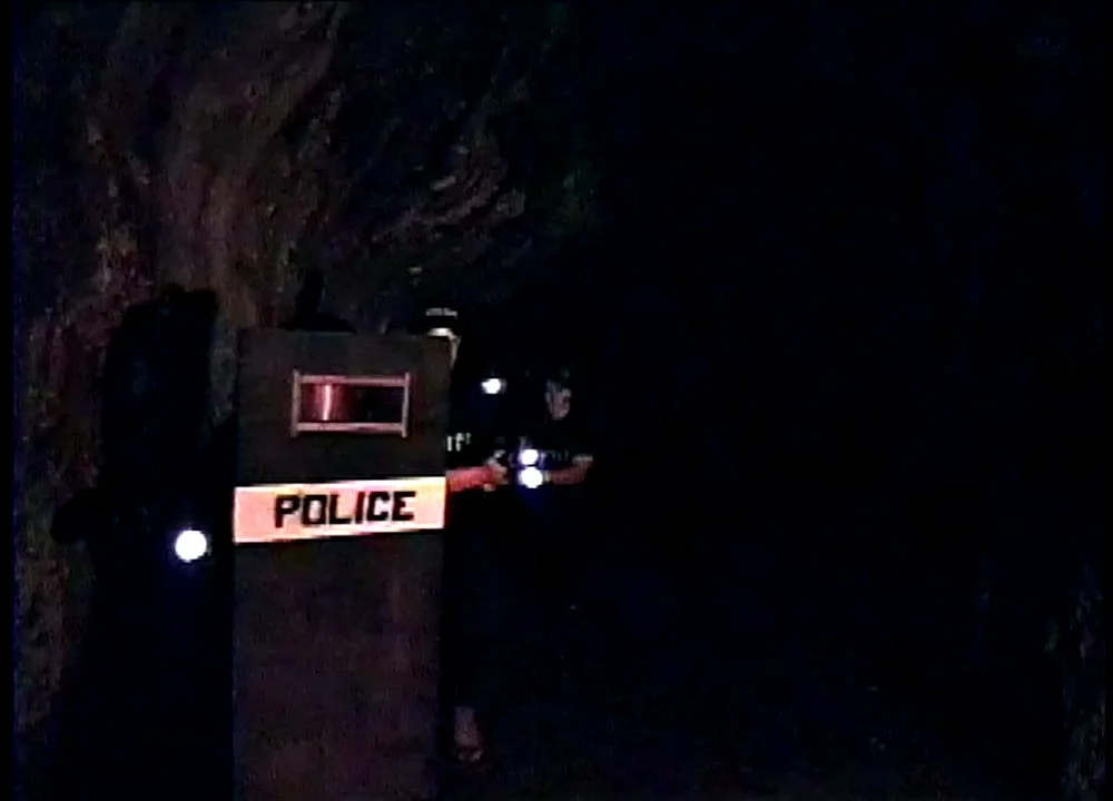 We go now live to the scene, with a bunch of police in tshirts and hand crafted riot gear. They're on the hunt for this supposed monster, and doing what cops do.